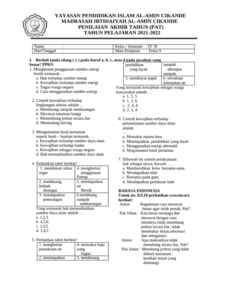 Penilaian Akhir Tahun (PAT) merupakan momen penting bagi siswa kelas 4 SD untuk mengukur sejauh mana pemahaman mereka terhadap materi yang telah dipelajari sepanjang tahun ajaran. Khususnya pada Tema 9, yang umumnya mencakup topik-topik menarik seperti "Kayanya Negeriku" atau "Benda-Benda di Sekitar Kita," penguasaan materi sangatlah krusial. Untuk membantu siswa mempersiapkan diri secara optimal, mengunduh soal PAT Tema 9 kelas 4 SD menjadi salah satu strategi yang efektif. Artikel ini akan memandu Anda secara lengkap, mulai dari pentingnya latihan soal hingga cara mencarinya secara daring.
