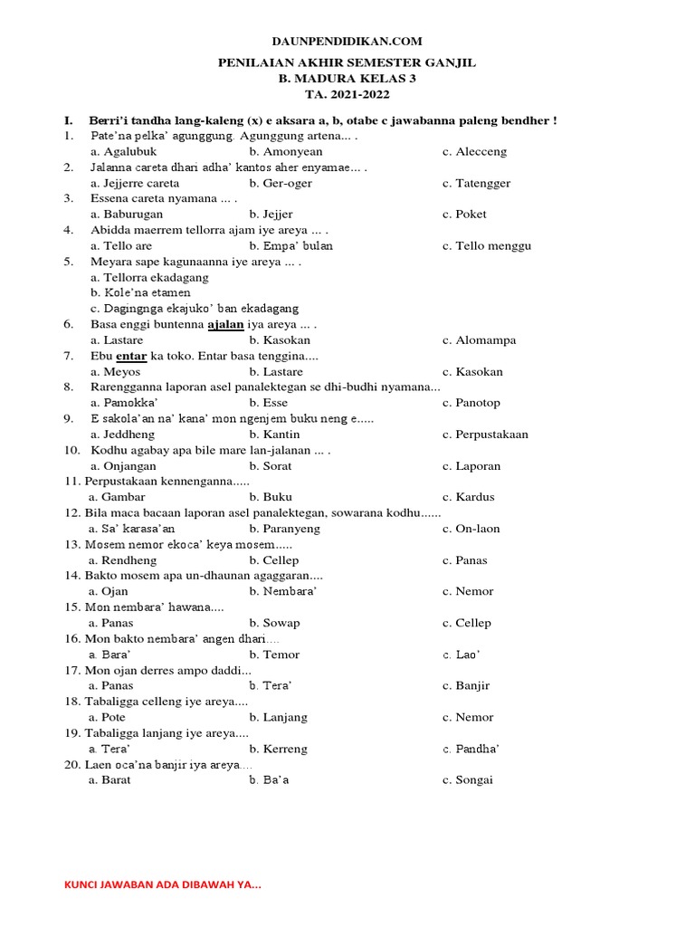 Berikut paneka conto soal basa Madura ka’ kelas 3 semester 2 se bisa eangguy ka’angghuy nguji pangarteyanna na’-kana’: