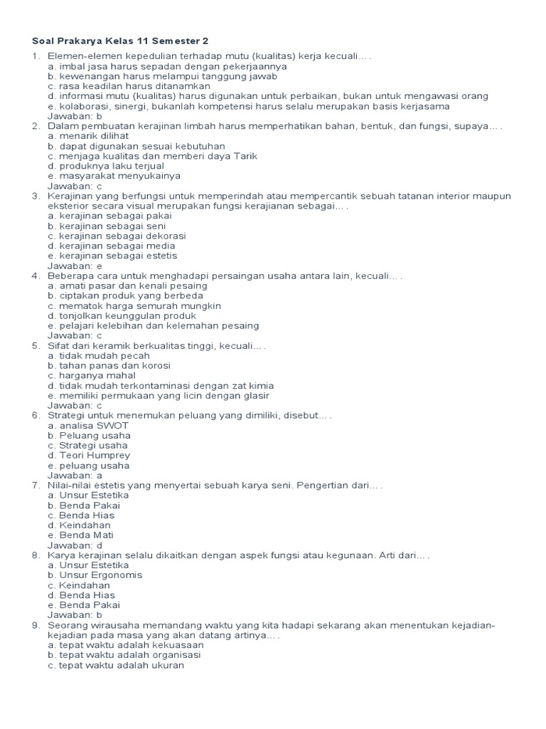 Berikut adalah beberapa contoh soal prakarya kelas XI semester 2 yang dapat digunakan sebagai bahan latihan: